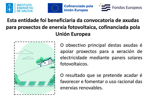 01/09/2025El Ayuntamiento de Outes fue beneficiario de una ayuda del INEGA (Instituto Energético de Galicia) para la realización de proyectos de energía fotovoltaica, para el año 2024, cofinanciada por el Fondo Europeo de Desarrollo Regional, en el marco del Programa Galicia FEDER 2021-2027.