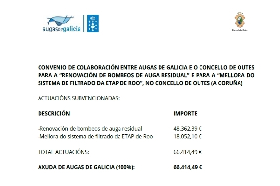 El alcalde de Outes Francisco Calo firmó un convenio con Augas de Galicia para la renovación de los bombeos de aguas residuales y para la mejora del sistema de filtrado de la ETAP de Roo por un valor de 66.414,49 €