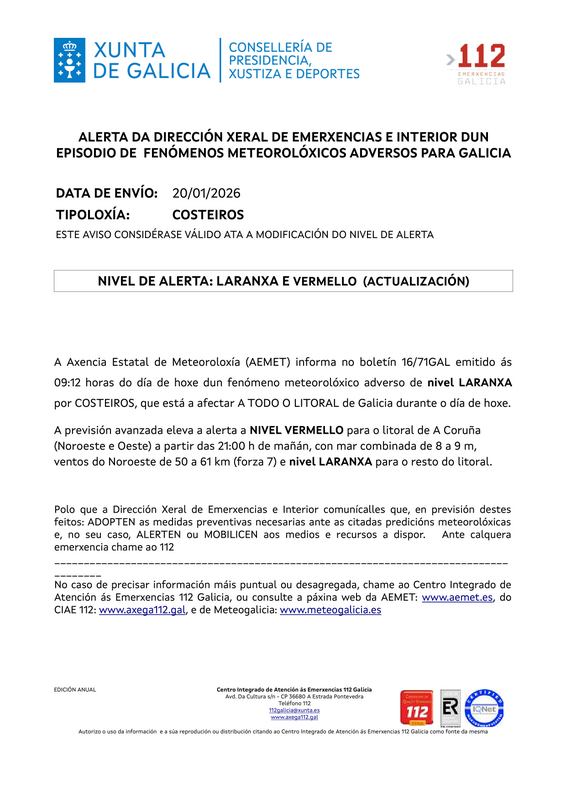20/01/2026La Agencia Estatal de Meteorología (AEMET) informa de un fenómeno meteorológico adverso de nivel NARANJA por COSTEROS durante el día de hoy. La previsión avanzada eleva la alerta a NIVEL ROJO en el litoral de A Coruña (Noroeste y Oeste) a partir de las 21:00 h de mañán con mar combinada de 8 a 9 m, vientos del Noroeste de 50 a 61 Km (Fuerza /) y NIVEL NARANJA para el resto del litoral.