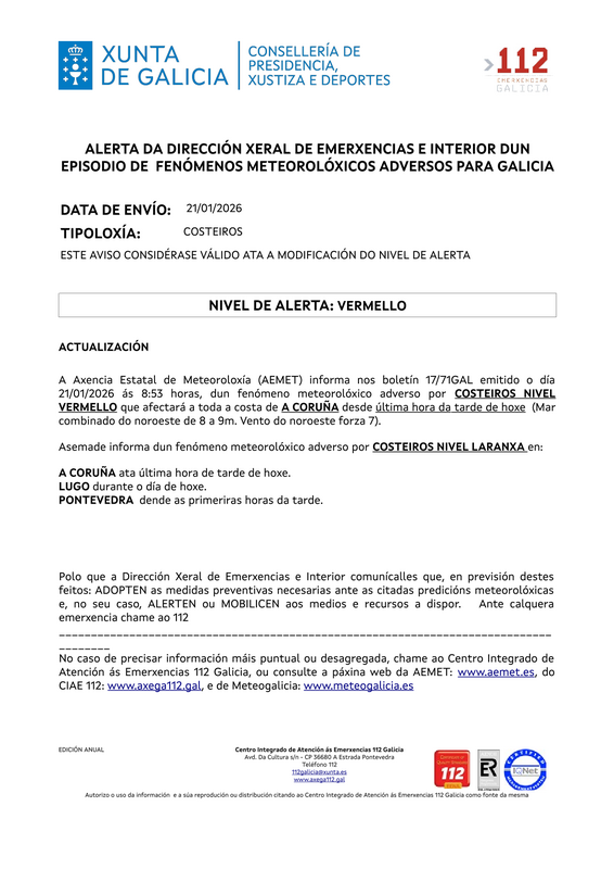 21/01/2026La Agencia Estatal de Meteorología (AEMET) informa de un fenómeno meeorolóxico adverso por COSTEROS NIVEL ROJO que afectará a toda la costa de A Coruña desde última hora de la tarde de hoy (Mar