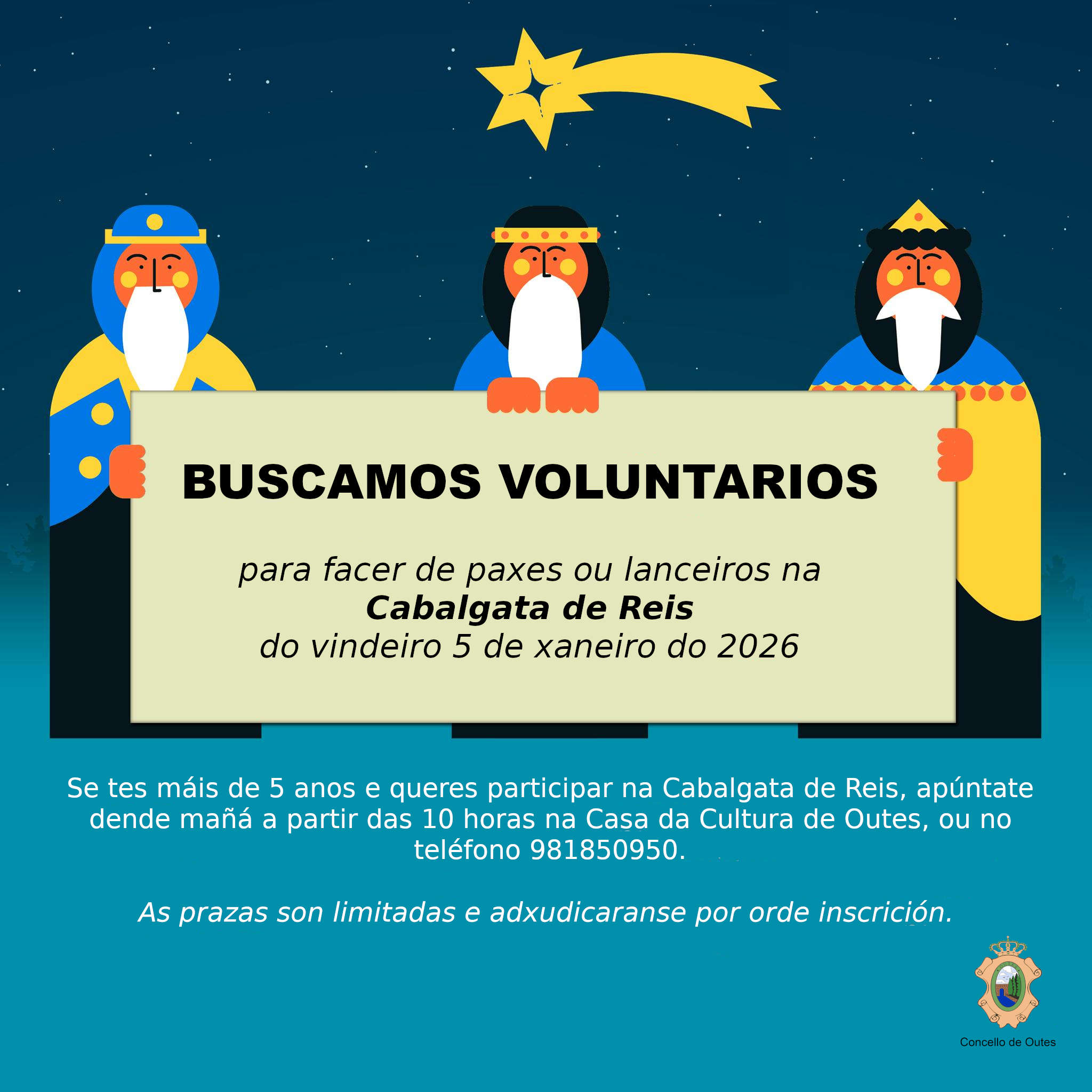 Se tes máis de 5 anos e queres participar na Cabalgata de Reis, apúntate dende o día 16 de decembro a partir das 10 horas, na Casa da Cultura de Outes ou no teléfono 981850950.