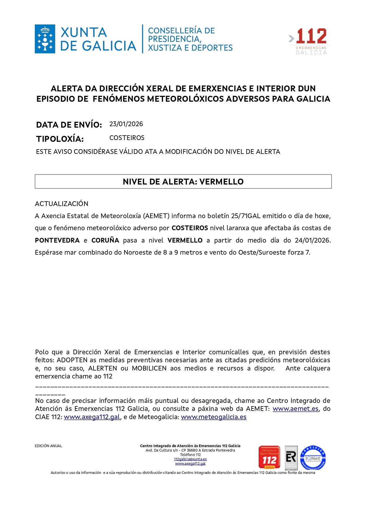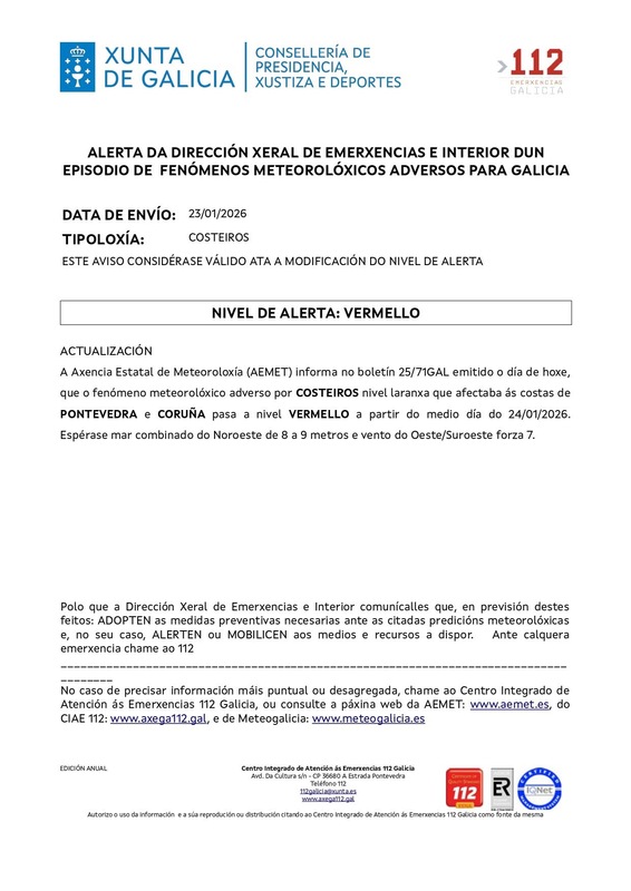 A Axencia Estatal de Meteoroloxía (AEMET) informa que o fenómeno meteorolóxico adverso por COSTEIROS nivel laranxa que afectaba ás costas de PONTEVEDRA e CORUÑA pasa a nivel VERMELLO a partir do medio día do 24/01/2026.