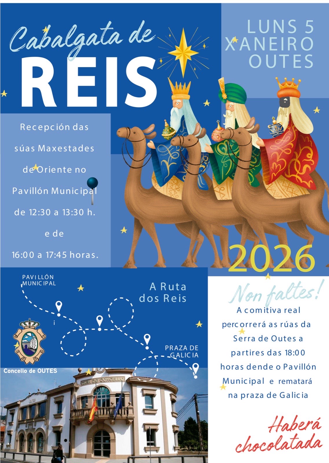 O vindeiro luns 5 de xaneiro as súas Maxestades de Oriente recibirán á rapazada de Outes no Pavillón Municipal entre as 12:30 e as 13:30 e dende as 16:00 ata as 17:45. Pola tarde, dende as 18:00, a comitiva real percorrerá as rúas da Serra dende o Pavillón Municipal para rematar na Praza de Galicia. Ao remate haberá chocolatada.