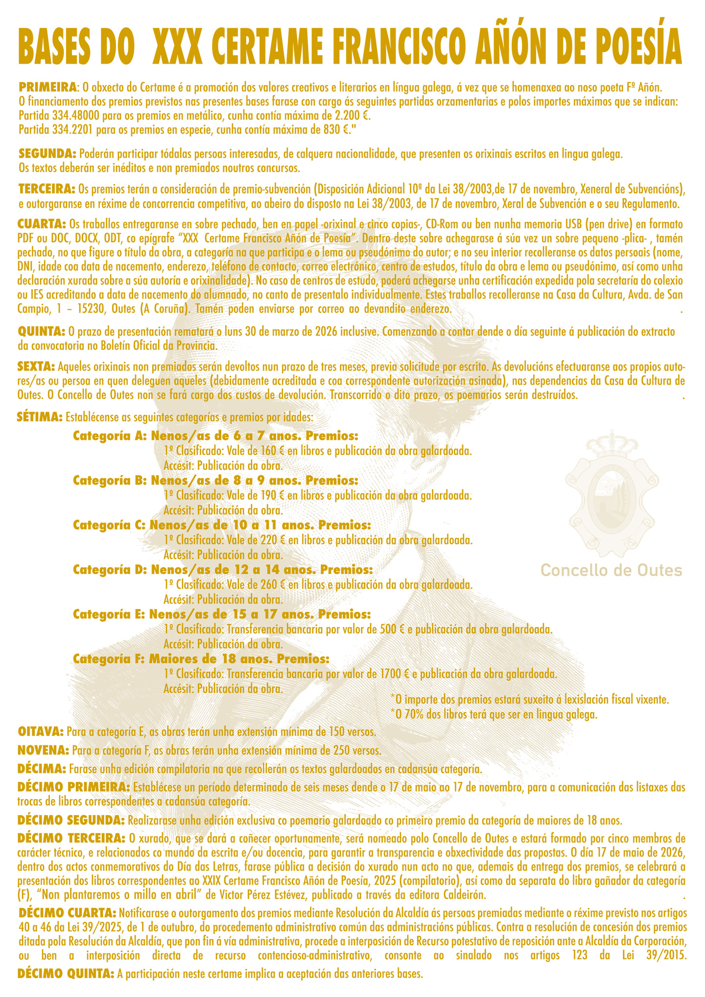 O Concello de Outes, compromotido e interesado en promover os valores creativo-literarios da nosa lingua, organiza o XXX CERTAME FRANCISCO AÑÓN DE POESÍA, certame que leva o nome do máis ilustre literato do noso concello, Francisco Añón, autor do "Rexurdimento" e un dos precursores da lingua galega e ao cal queremos render homenaxe con este premio.
