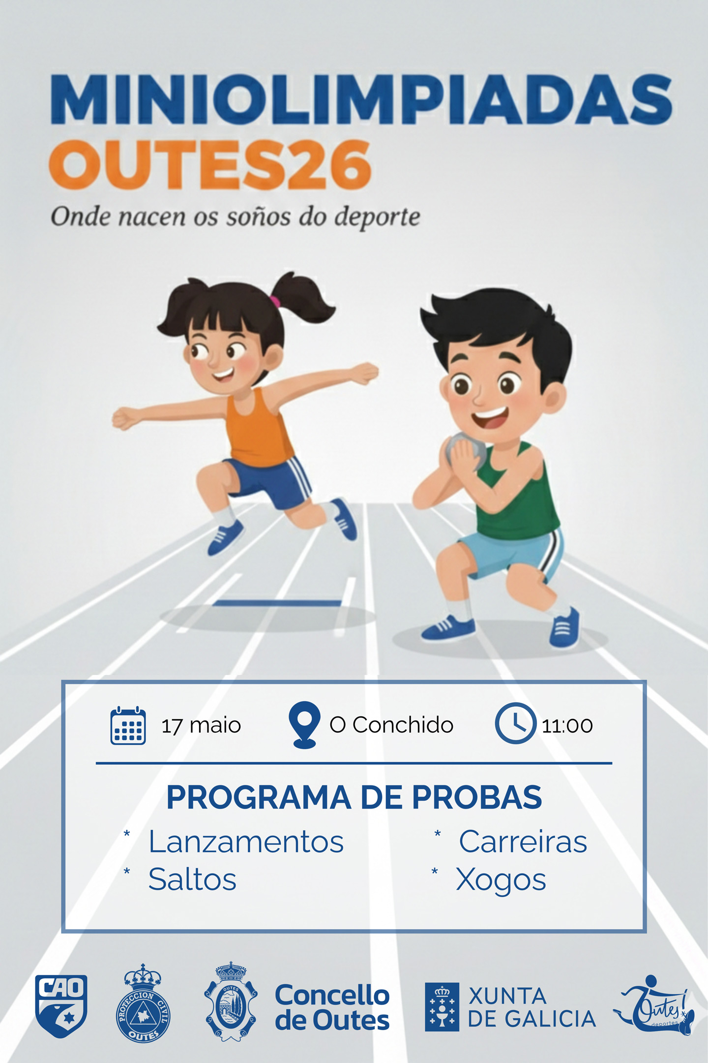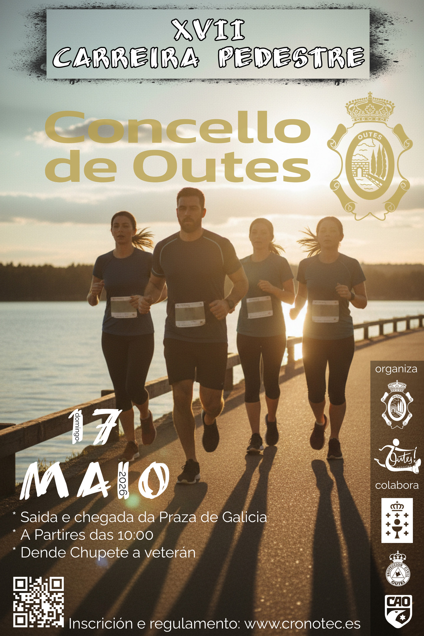 A Concellería de Deportes do Concello de Outes organiza a XVII Carreira Pedestre de Outes, que terá lugar o venres 17 de maio de 2026 a partir das 10:00 horas, con saída e chegada na Praza de Galicia.