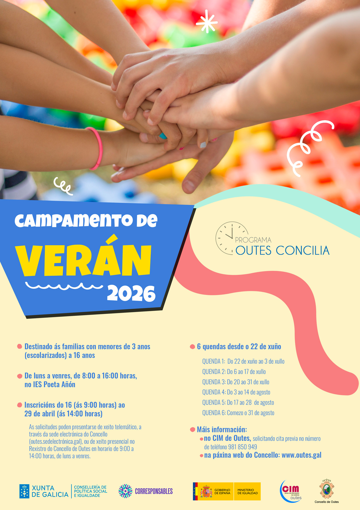 O Concello de Outes abre o prazo de inscrición para o Campamento de verán 2026 do Programa “Outes Concilia” desde as 9:00 horas do 16 de abril ás 14:00 horas do 29 de abril. Un total de 320 prazas, distribuídas en 6 quendas, estarán dispoñibles para as familias con menores desde os 3 anos (escolarizados) ata os 16 anos.