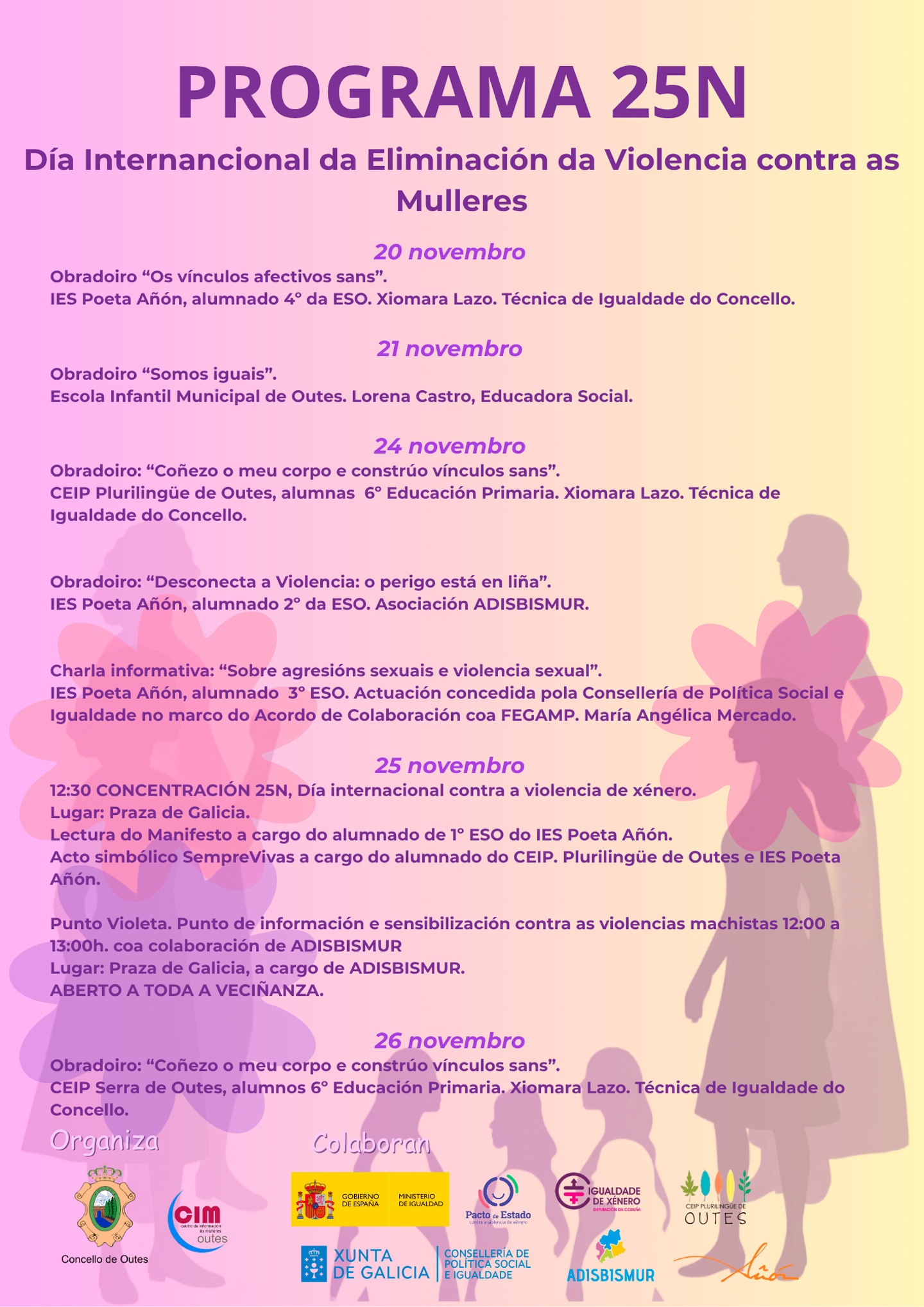 Con motivo da conmemoración do 25N, Día Internacional para a Eliminación da Violencia contra as Mulleres, o Concello de Outes dá a coñecer a súa programación.